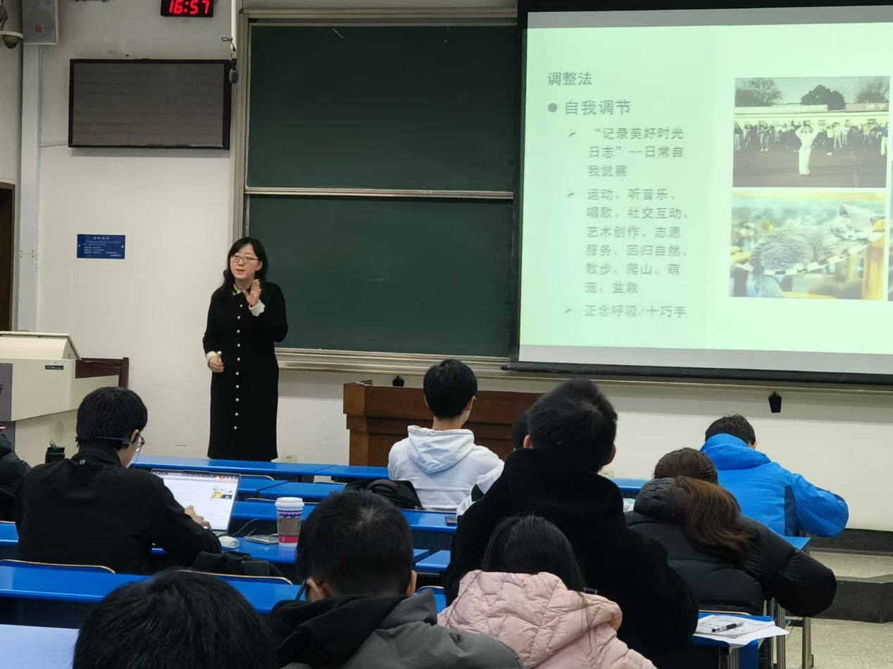 赵颖详细介绍了心理调节的措施,并对讲座进行总结。她表示,同学们要了解大学阶段可能遇到的问题,积极认识和探索自己的内在资源,并充分利用外部资源实践探索,进而保证自己的心理健康。