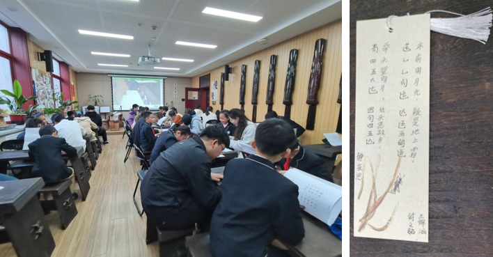 最后,大学生们与小朋友们一加一合作完成减字谱《静夜思》的临摹,在花笺上留下了古琴谱和一大一小两个名字。
