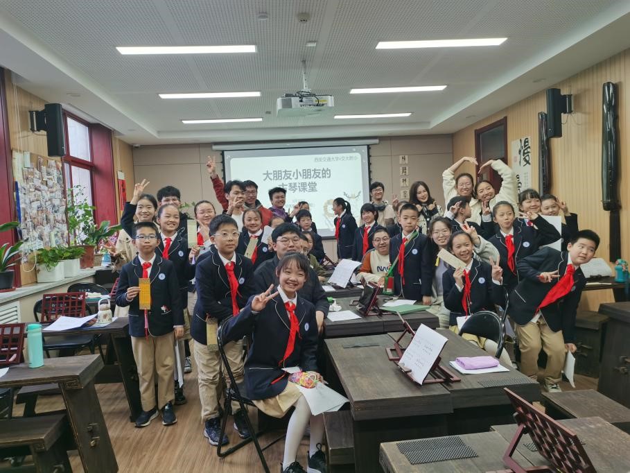 近日,西安交通大学东二楼358教室里举行了一堂别开生面的古琴课。来自西安交通大学不同专业的15位本科生、硕士生、博士生们,与来自交大附小的20位小朋友愉快互动,共同走近中国古典乐器——古琴,了解传承中华优秀传统文化。