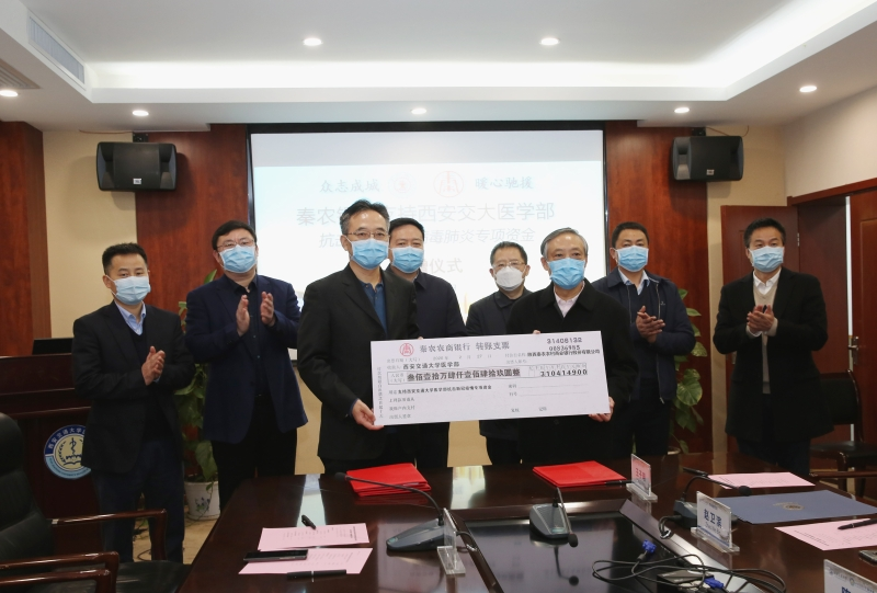 新型冠状病毒感染的肺炎疫情,牵动着每个人的心。在这场没有硝烟的战争中,所有交大医学人众志成城、与时间赛跑,全力以赴抗击疫情。在抗击疫情的力量中,越来越多的企业加入到这场“战役”中,陕西秦农农村商业银行股份有限公司时刻关注疫情形势。2020年,为支持交大医学部抗击“新冠病毒”疫情。秦农银行向西安交通大学医学部捐赠设立“秦农银行新冠疫情研究专项”,用于关于新型冠状病毒开展科研攻关,加强传染源、传播致病机理等理论研究、临床诊治及人才建设。资助具有针对新型冠状病毒(COVID-19)的病毒溯源、致病机理、传播感染、防控治疗等相关研究背景和条件的教师开展应急防治技术科研攻关,解决关键致病机制、新颖快速诊断检测技术、临床防控和治疗以及药物研发等重大科学问题。建设生物样本库以支持相关研究。